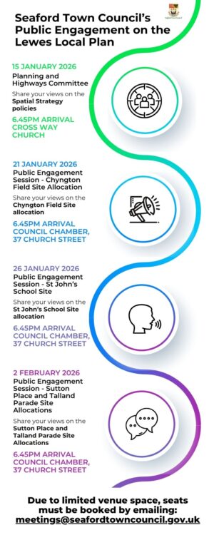Seaford Town Council is running a series of facilitated public engagement sessions during January/February to gather views from members of the public to help inform the Town Council’s consultation response to the Lewes Local Plan.